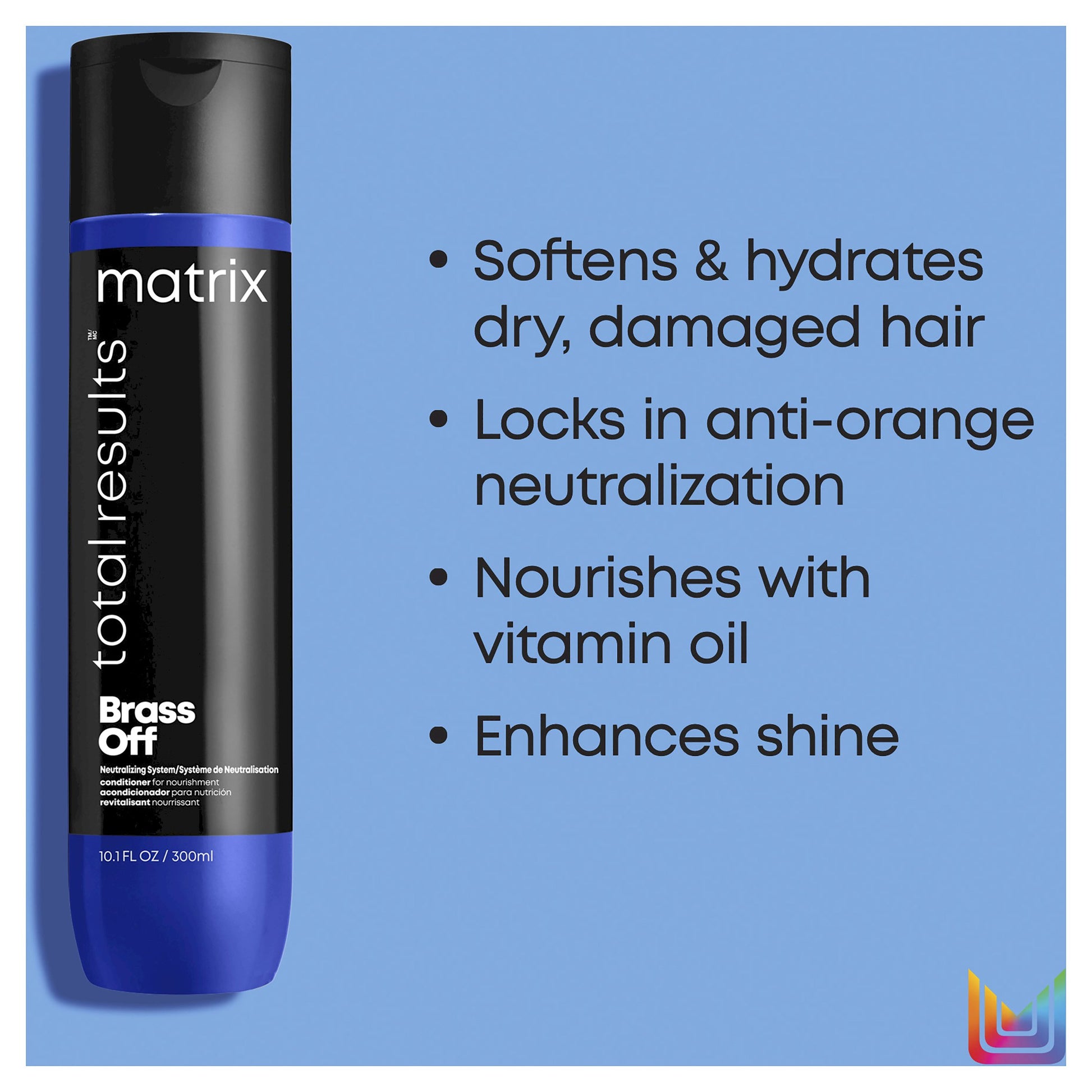 Treat brassiness and nourish and moisturise dry hair with Matrix Total Results Brass Off Conditioner. This non-colour depositing formula helps hair retain cool tones while softening and replenishing dry and brittle hair. When used as a follow-up, this conditioner locks in the anti-orange neutralisation achieved by Brass Off Shampoo. Infused with vitamin oil, this formula enhances shine.