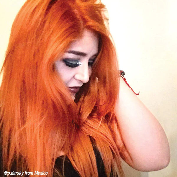 Electric Tiger Lily is a bright orange neon hair dye that glows like a fresh spring lily. This shade glows brightly under black lights, so for best results, we recommend lightening hair to the lightest level 10 blonde before use.
