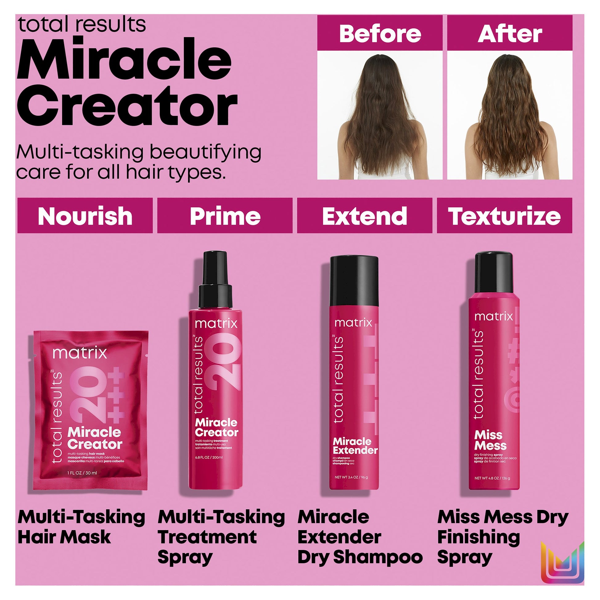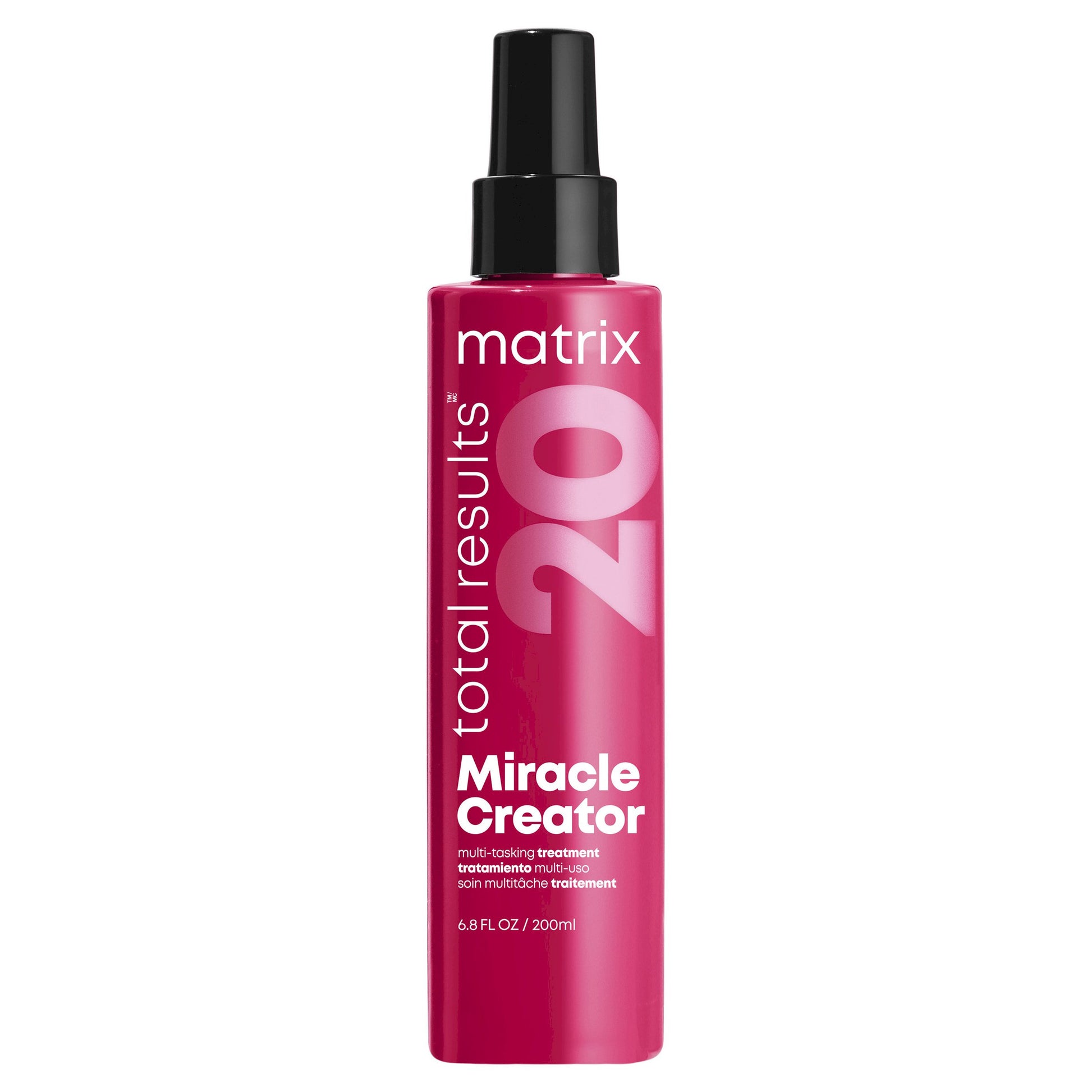 Matrix Total Results Everyday Miracles Miracle Creator has 20 beautifying benefits for your hair: leave in for nourishment, boosts shine, smooths the cuticle, helps prevent breakage from brushing, adds moisture, helps prevent heat damage, helps fight frizz, helps even out porosity, minimises damage, detangles, reduces dryness, conditions lightly, controls fly-aways, helps prevent split ends, helps soften, makes blow dry process easier, helps correct roughness, helps shield against external aggressors, improves manageability, primes hair for styling.